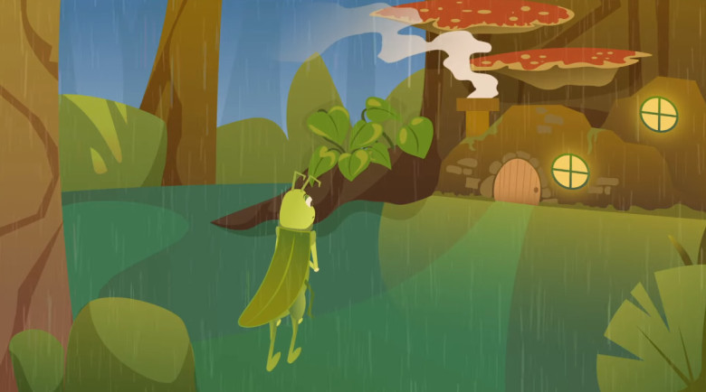 Musim hujan pun tiba belalang yang tidak mempunyai cadangan makanan dengan terpaksa menyusuri hutan untuk mencari makan, hingga ia sampai di depan rumah semut. Dengan perasaan yang malu belalang akhirnya memberanikan diri untuk mengetuk pintu rumah semut.
