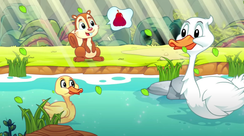 Kisah Kancil: Persahabatan Bebek dan Tupai, diceritakan bahwa bebek dan tupai bersahabat sejak lama. Tupai mengabari bebek kalau di sebrang Sungai ada pohon jambu yang sedang berbuah ranum.