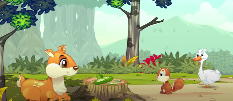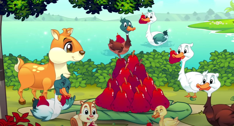Tupai memanjat pohon untuk mengambil jambu – jambu yang sudah matang dan para bebek mengumpulkan jambu yang sudah di petik tupai. Kemudia tupai, bebek, dan kancil makan jambu Bersama – sama.