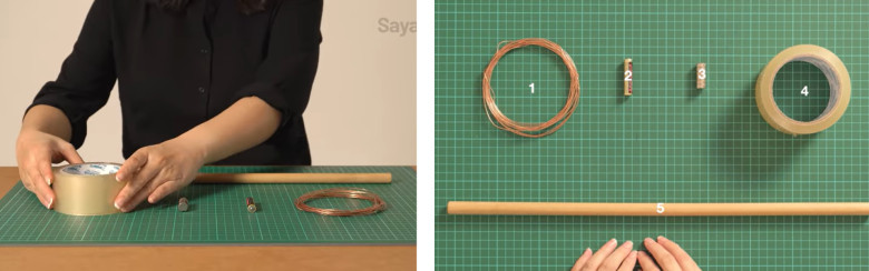 1. Siapkan alat-alat yang diperlukan untuk esperimen, yaitu: Kawat tembaga 20 m, baterai 1, 4 magnet neodinium, solasi, dan stik kayu.