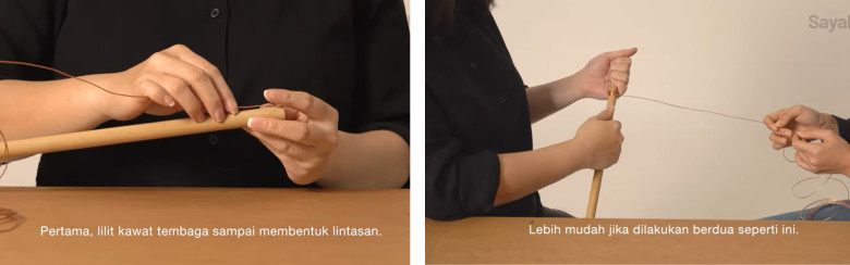 2. Lilit kawat tembaga sampai membentuk lintasan, pastikan kawat yang digunakan tidak memiliki lapisan enamel supaya aliran listrik terhantar dengan baik.