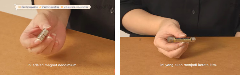 Halo! Siapa disini yang suka bereksperimen? Kali ini, kita akan melakukan eksperimen yang menarik loh! Kita akan membuat kereta electromagnetic menggunakan batu baterai, magnet, dan kawat tembaga, nih! Dalam eksperimen ini, batu baterai berfungsi sebagai sumber listrik, yang terhubung dengan kawat tembaga yang diatur sebagai rel. Saat arus listrik dialirkan melalui kawat tembaga, medan magnet terbentuk di sekitar rel. Kereta yang dilengkapi dengan magnet atau sistem elektromagnet berinteraksi dengan medan magnet tersebut. Sehingga menciptakan gaya dorong atau tarik yang mendorong atau menarik kereta ke depan, dan kita akan melihat bagaimana kereta bisa bergerak tanpa sentuhan langsung.