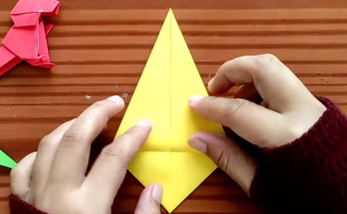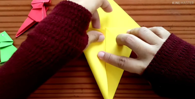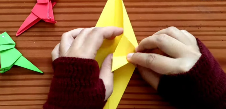 11. Tekuk bagian atas sebanyak 3 lipatan, hingga membentuk lipatan kecil sebagai tangan dinosaurus. Lakukan juga pada sisi satunya
