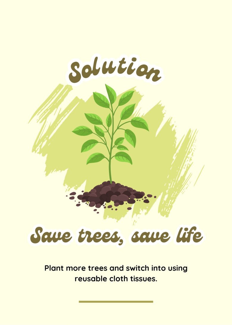 SAVE TREES SAVE LIFE - We can start by planting more trees and plants. We can switch into using reusable cloth tissue because it doesn’t harm the environment.