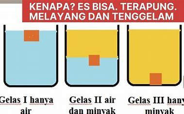 Mengapa demikian? Jadi yang membedakan air dan minyak adalah masa jenisnya. Masa jenis air lebih besar daripada masa jenis es batu. Sedangkan masa jenis es batu lebih besar daripada masa jenis minyak. Di dalam zat cair, sebuah benda yang memiliki massa jenis lebih besar dari air maka benda itu akan tenggelam. Sebaliknya bila sebuah benda memiliki massa jenis yang lebih kecil dari air maka benda akan mengapung. Ketika massa jenis benda sama atau hamper sama dengan massa jenis air, maka benda akan melayang di air.