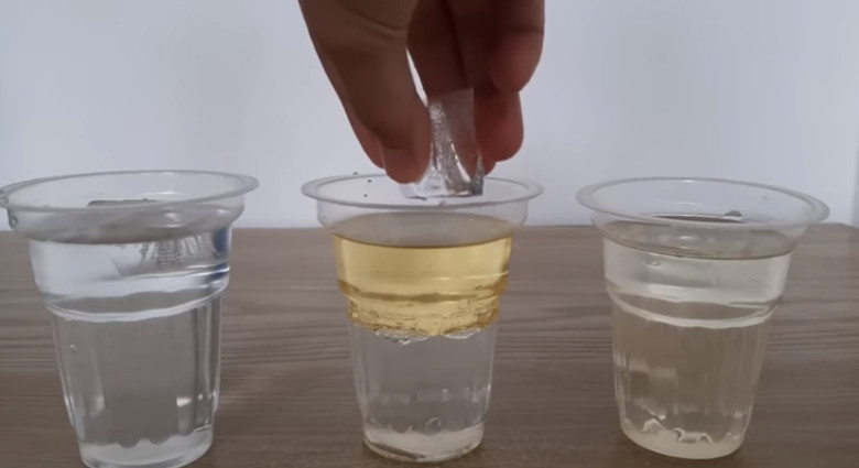 Es batu yang berada di gelas yang berisi air akan terapung dan cepat mencair. Sedangkan es batu pada gelas yang berisi minyak akan tenggelam dan memerlukan waktu lebih lama untuk mencair. Es batu yang berada di gelas campuran air dan minyak akan mengapung di tengah tengah dan mencair lebih lambat dari gelas yang berisi air.