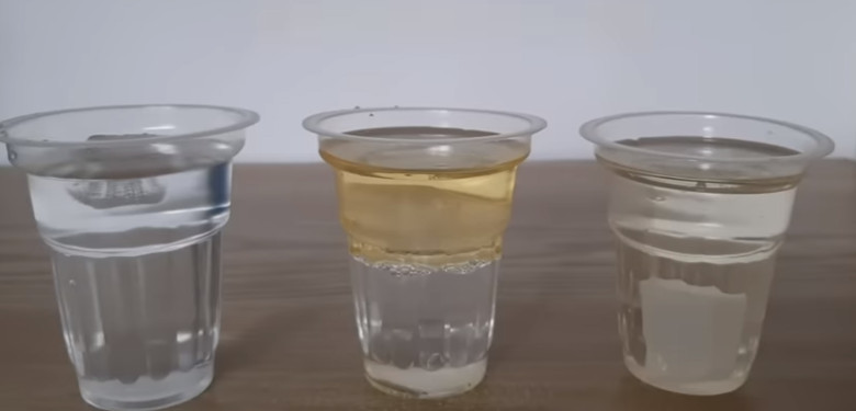 Isi ketiga gelas masing - masing dengan minyak, air, air dan minyak