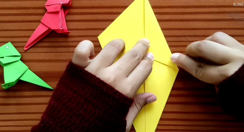 11. Tekuk bagian atas sebanyak 3 lipatan, hingga membentuk lipatan kecil sebagai tangan dinosaurus. Lakukan juga pada sisi satunya